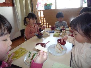 ☆このところ、ずっとサンドイッチ漬けの日々をすごしてきた2,3歳児クラスのみんな。いえ、サンドイッチを食べ続けていたわけではなくて、サンドイッチを作る活動に向けて、のもろもろをやっていた、ということですけどね。絵本をみたり、サンドイッチの作り方を練習したり、カレンダーの紙でエプロンをつくったり・・・。食べることに関してですから盛り上がりも半端じゃなかったのですが、今日はいよいよ本番。エプロン、マスク、ゴム手袋で身支度もばっちりです。ひとりずつ作る間も、いつもの騒々しさは皆無、ひたすら集中している様子はすばらしかったですよ!サンドイッチの中身は、ハム、チーズ、胡瓜、トマト、レタス、パンにマーガリンもしっかり塗りました。息を詰めるようにして、具をひとつづつ重ね、もう一枚のパンでふたをして、フーッ!ジャム付きのもつくり、天板にはうず高いパンのやまができました。ミネストローネもできあがり、さぁ、お昼だ、お昼だ!おにいさん、おねえさんのつくってくれたサンドイッチ、小さいひとたちもパクパクいっぱい食べました。ボリュームたっぷりだったんですけど、作った本人たちも負けていません。いやはや良くたべました。