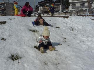 ☆ 毎日、毎日、雪遊び!そりの扱いもすっかり上手になり、みんなびゅんびゅんすべっています。初日に泣いたあの子も、2日めには、自分で雪の上にすわり、お尻ですべりはじめました。赤ちゃんクラスのこどもたちも抱っこされて、楽しそうに初すべり。ちょっとびっくり顔でしたけどね。思いがけない雪ですっかり雪国気分を味わったこどもたち、きのうは誰かさんのつくった「かまくら」も体験してしまいましたよ!