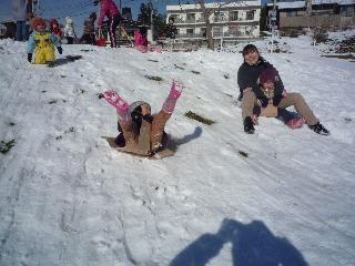 ☆ 毎日、毎日、雪遊び!そりの扱いもすっかり上手になり、みんなびゅんびゅんすべっています。初日に泣いたあの子も、2日めには、自分で雪の上にすわり、お尻ですべりはじめました。赤ちゃんクラスのこどもたちも抱っこされて、楽しそうに初すべり。ちょっとびっくり顔でしたけどね。思いがけない雪ですっかり雪国気分を味わったこどもたち、きのうは誰かさんのつくった「かまくら」も体験してしまいましたよ!