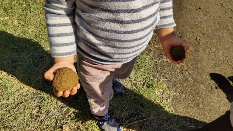 「ちがうよ おにぎりだよ」…と まるまるした どろだんご(もしくは どろおにぎり)を みせっこしたり