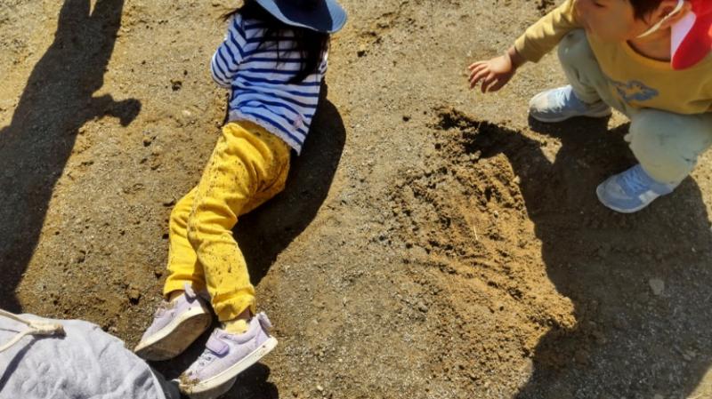 「ちがうよ おにぎりだよ」…と まるまるした どろだんご(もしくは どろおにぎり)を みせっこしたり