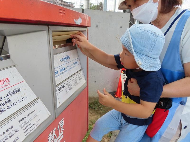 切手も自分たちで貼り、少し離れたポストまでおでかけ。ひとりづつ抱っこしてもらってポストにぽとん!