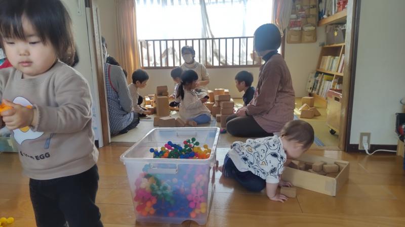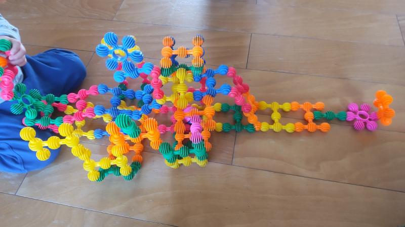 これはいいぞ と 思えると となりの コルク積み木コーナーに 駆けていっては