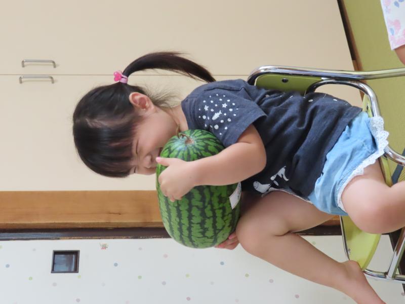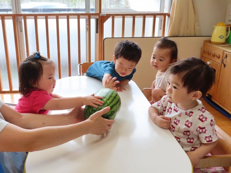 コンコンとスイカを叩いて音を聞いてみたり、2歳児クラスでは、順番にスイカを持ち上げてみたりして本物のスイカの感触をじっくりと味わっていました♪