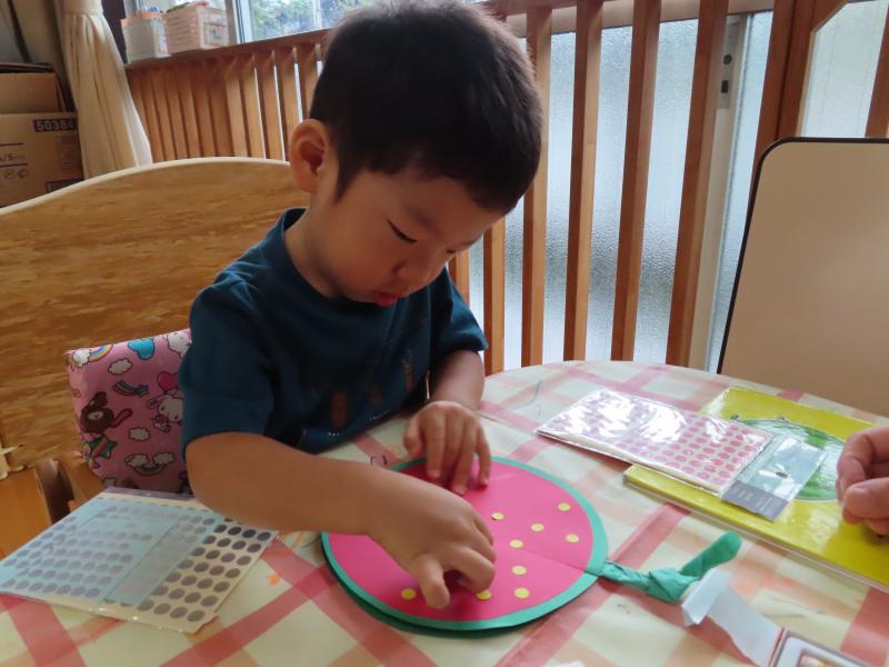 スイカ製作に真剣な表情の1歳児さん(3・4枚目)