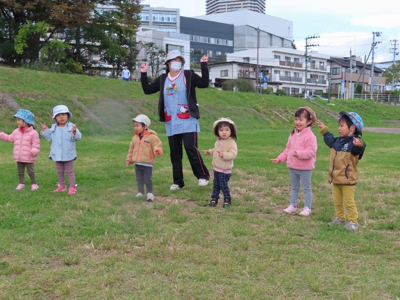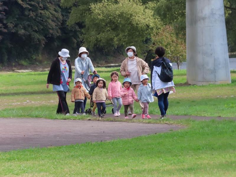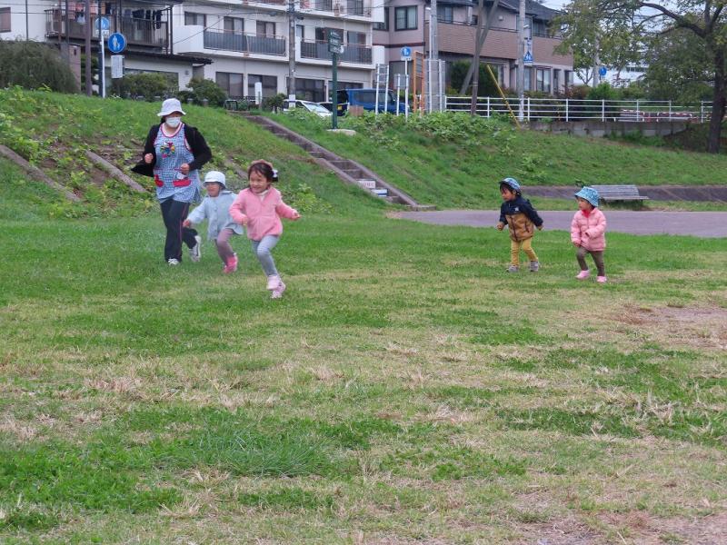 ギリギリまで待ってなんとか開催することが出来ましたが、雲行きは怪しい雰囲気・・・それでも、原っぱへ出発して体操をしたり、かけっこをすることができました。