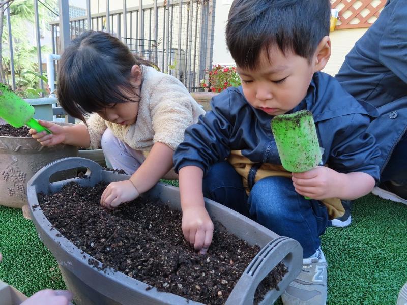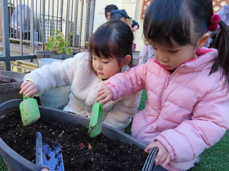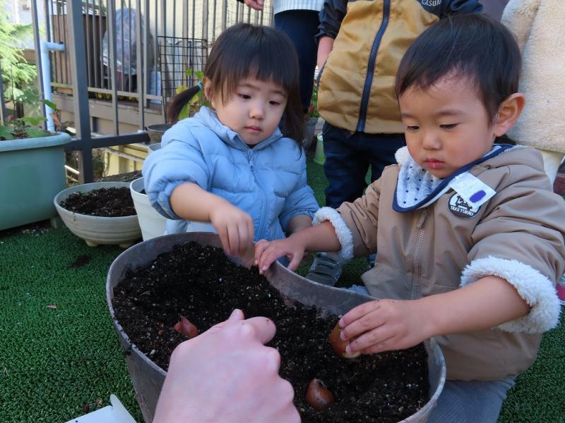 2歳児クラスでは、「何色のチューリップが咲くかな~」「あか!」「ピンク!」「きいろ!」「あお!」とそれぞれ好きな色を想像して、期待感でいっぱいです。