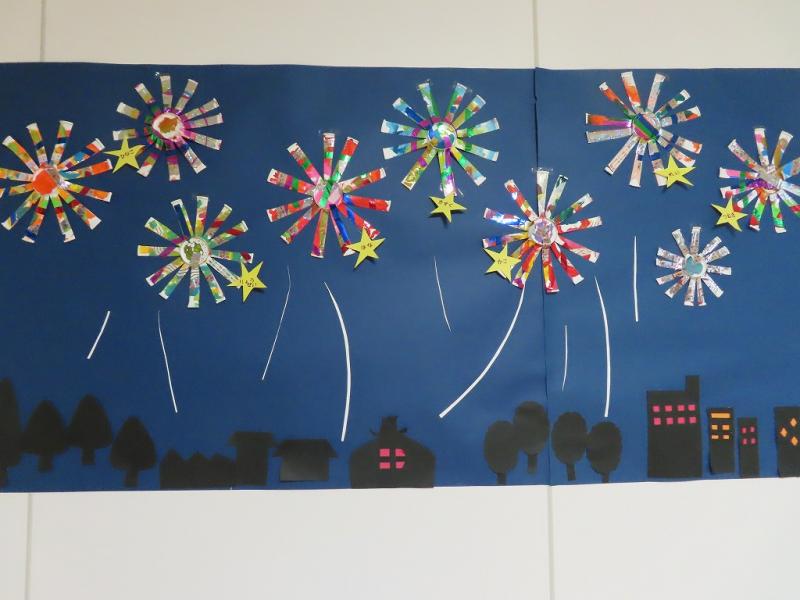 今年もコロナで花火大会もできないけど、みんなが作った(紙コップです)花火、見てください。