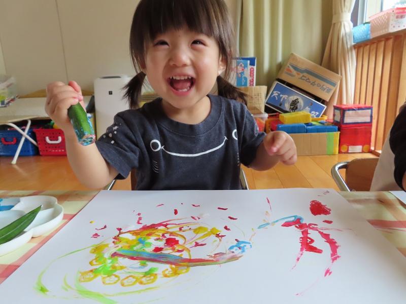 0・1歳さんはオクラでスタンプに挑戦し、2歳さんは絵の具を塗ったり、お花をのりで貼ったりと、いろんな製作に取り組みました。できあがったお手紙はどれもとっても素敵でかわいいものになっていましたよ!