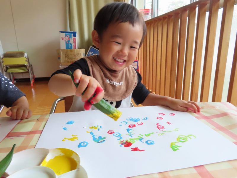 写真はポスト投函時の様子と0・1歳さんのオクラスタンプの様子です。楽しそうに取り組んでいる姿が伝わってきますね!