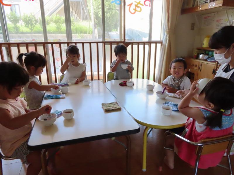 先週は夏が戻ってきたかのような暑さの中、2歳児クラスではアイス作りをしました。