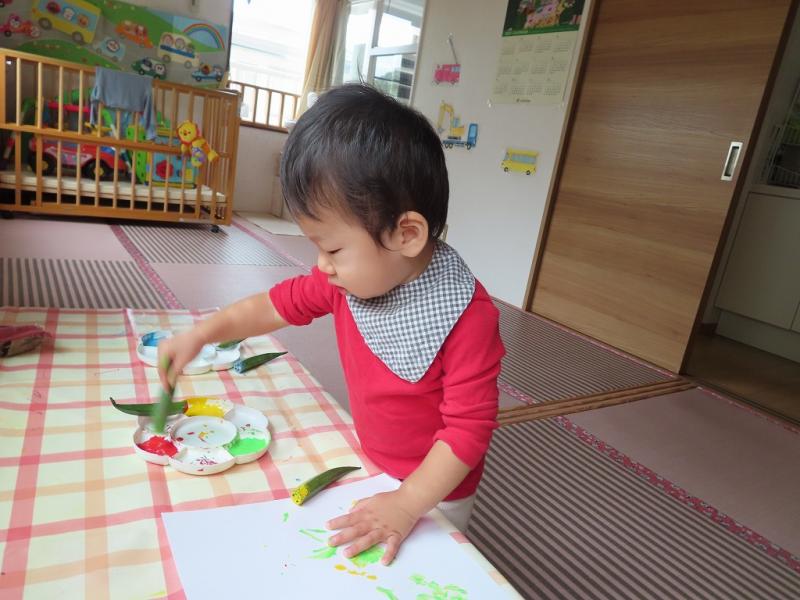 0・1歳さんはオクラでスタンプに挑戦し、2歳さんは絵の具を塗ったり、お花をのりで貼ったりと、いろんな製作に取り組みました。できあがったお手紙はどれもとっても素敵でかわいいものになっていましたよ!
