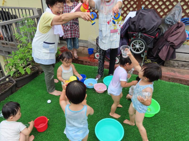 おやつを食べて、準備をして、いざ水遊び!準備中の2歳さんでは、「きょうね、あわあわするの!」と楽し気な声が聞こえてきます。