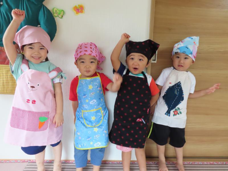 一人ひとりお家からエプロンと三角巾を持ってきてもらい、いざ変身!