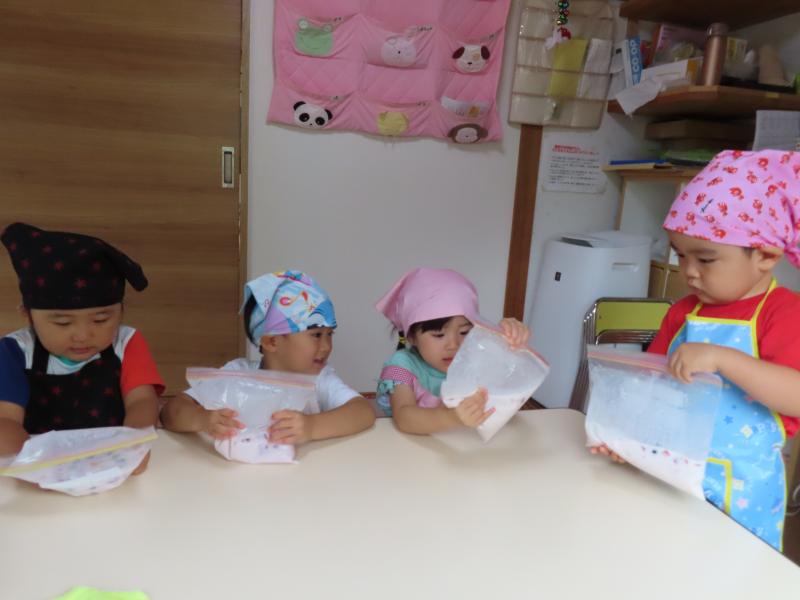 「今日のおやつは2歳さんの手作りアイスだよ~」