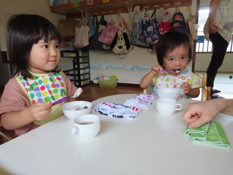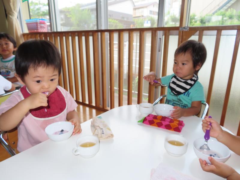 たっぷり遊んで、お昼寝した後はいよいよお待ちかね、おやつの時間。何が出るのかわくわくしながら待っていると、なにやら冷たくておいしそうなものが・・・