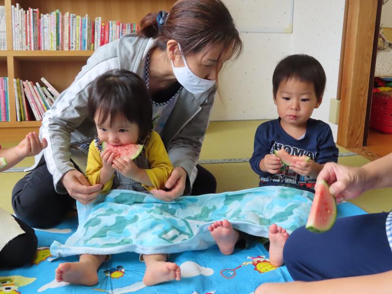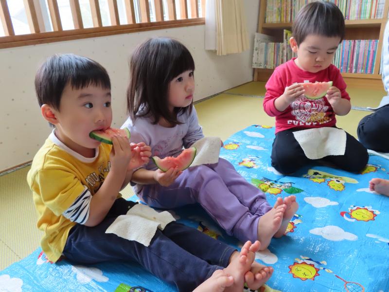 2歳さん、おいしいおやつ、ありがとう!ごちそうさまでした!! 今日も最高気温は30度を超え、何もしなくてもじわじわと汗が滲んでくるような暑さですね。子どもたちも頭からタラリ・・・と汗を流しながら、元気に遊んでいます!
