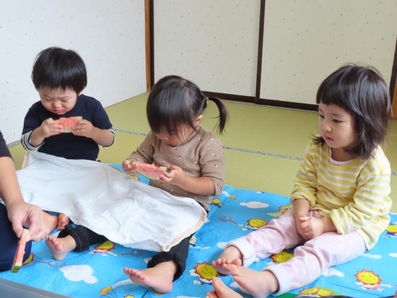 2歳さん、おいしいおやつ、ありがとう!ごちそうさまでした!! 今日も最高気温は30度を超え、何もしなくてもじわじわと汗が滲んでくるような暑さですね。子どもたちも頭からタラリ・・・と汗を流しながら、元気に遊んでいます!