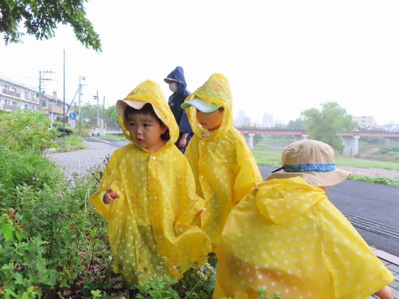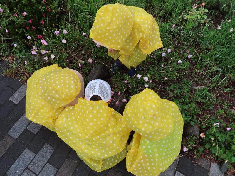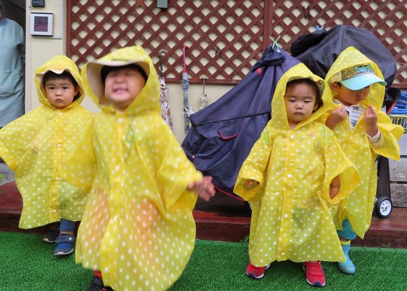 黄色いレインコートを着た子どもたちの後ろ姿のなんとかわいらしいこと!!!トコトコと歩く姿がまた、とってもかわいいのです!
