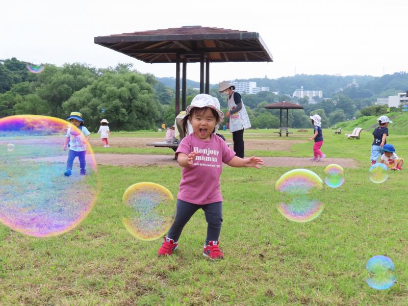 雨も降らず、ちょうどいい風。早速シャボン玉スタートです♪