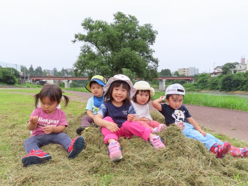 写真の最後は、草刈り後の草の山を発見した1歳児さんに2歳さんも加わって、集合写真みたいになった1枚です♪ 梅雨本番、九州は大変なことになっていますね!