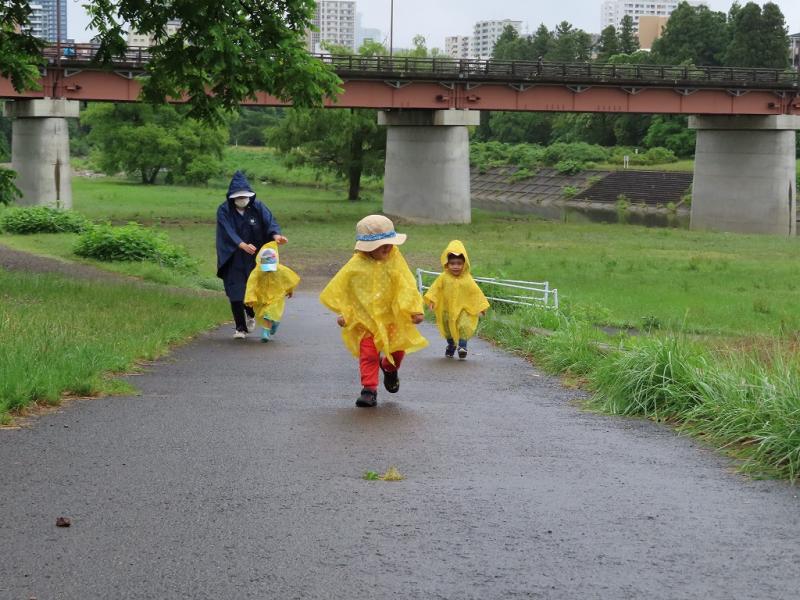 黄色いレインコートを着た子どもたちの後ろ姿のなんとかわいらしいこと!!!トコトコと歩く姿がまた、とってもかわいいのです!