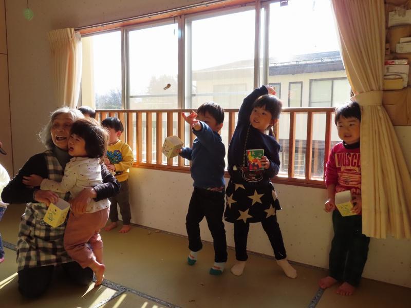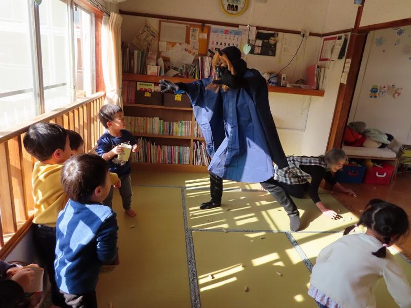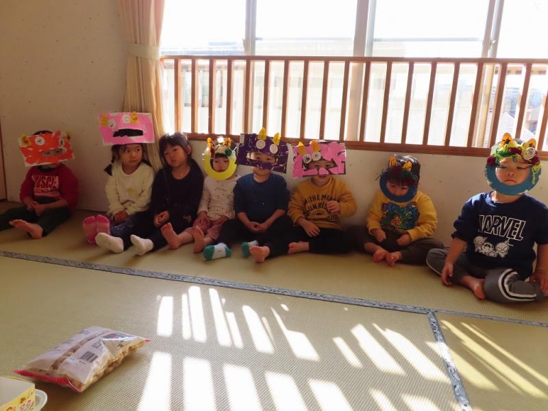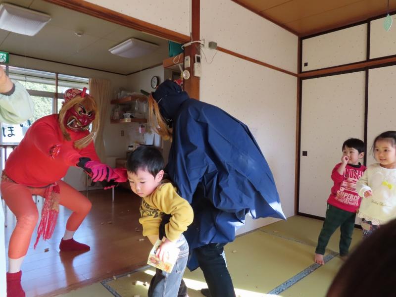 涙が止まらなくて動けない子、先生にしがみついて離れられない子もいたけれど、それでも大きいさんたちが勇気をふりしぼって「おにはーそと!!」と豆を投げていました!