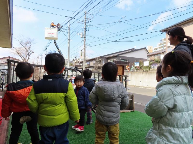 写真は、お雛様と、はたらくくるま大好きなみんな(高所作業車・ごみ収集車)です。