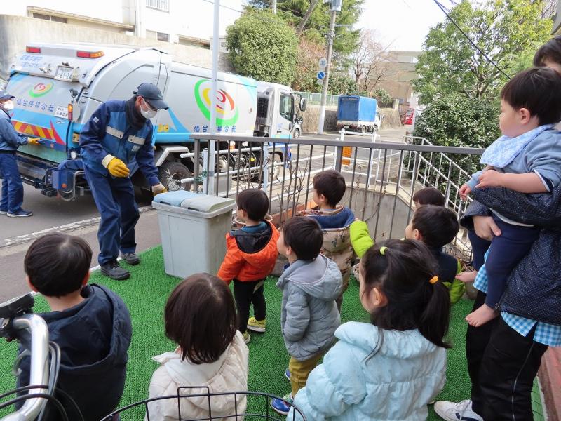 写真は、お雛様と、はたらくくるま大好きなみんな(高所作業車・ごみ収集車)です。