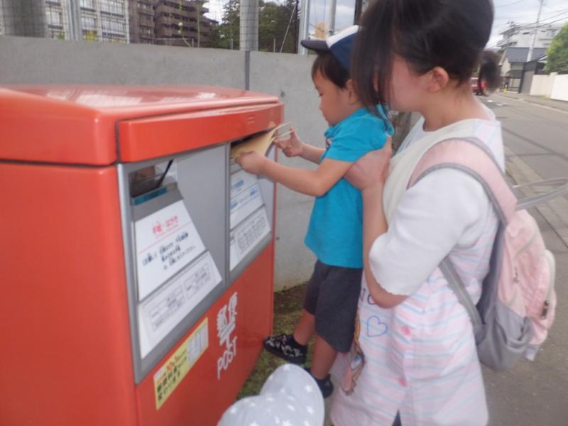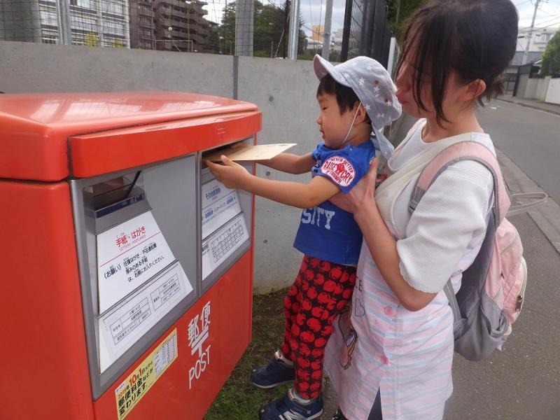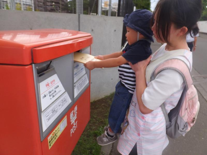 2歳児クラスのお兄さんたちは、両手で大切に封筒を持って、ポストにぽとん!