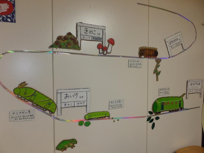 2月の壁面は、むしむしでんしゃ・・・かなりリアルな青虫電車が、かべをはいまわっています(走ってる、とはいいがたいので)