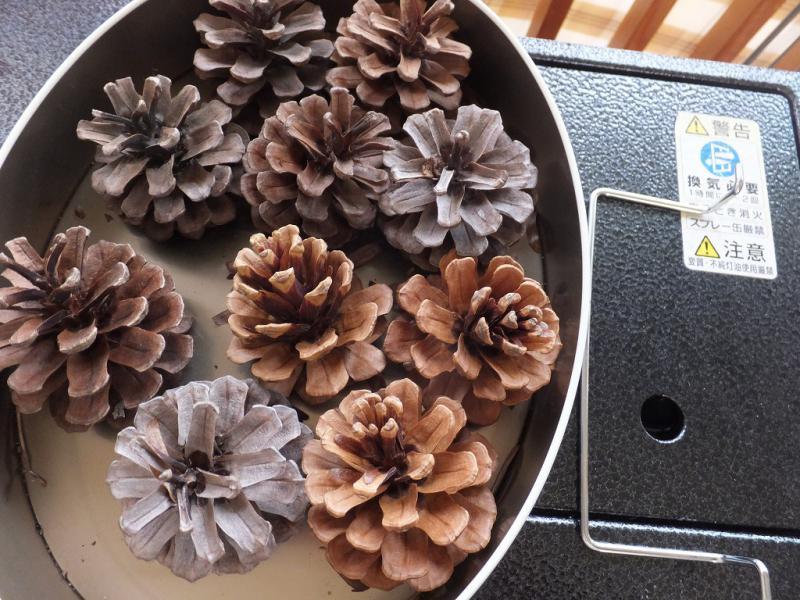 こどもたちのクリスマスツリー、ときれいに開いた松ぼっくりです(ストーブの上で乾かしました)。松ぼっくりはなににへんしんするのかな?
