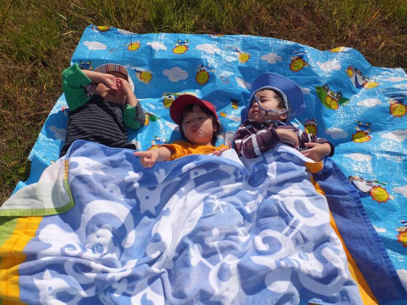 今日の2才さんたちは、ばばばあちゃんの絵本(「いそがしいよる」)のまねをして、外で寝てみることにしたらしい・・・