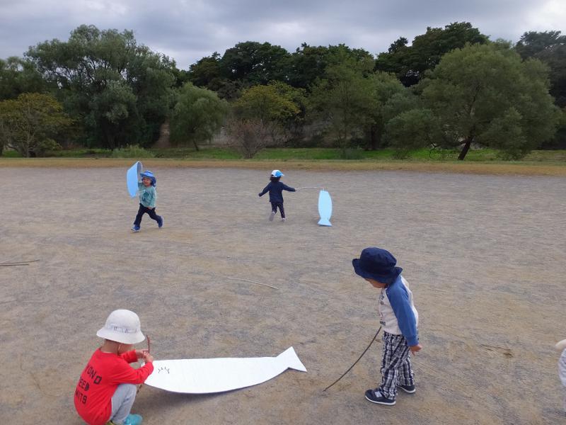 原っぱで魚釣りをしたりしたり、大型積木で遊んだり、