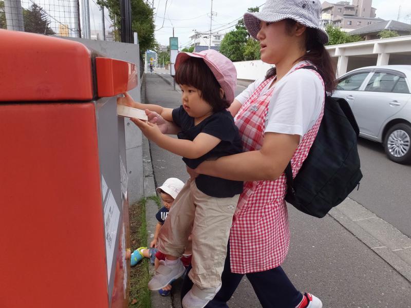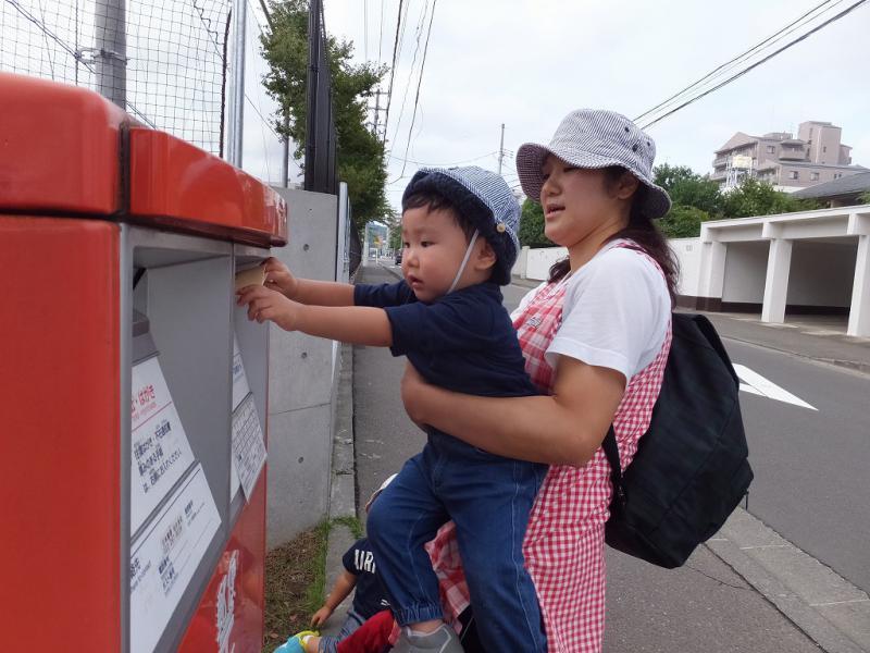 慎重に重さも量るようになりました。だから今日は絶対大丈夫!1才さん、2才さん仲良くポストまで行って、ポトン、してきました。おじいちゃん、おばあちゃん、喜んでくれるかな?