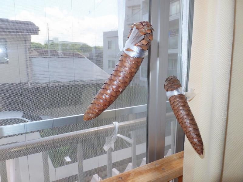 出勤時間には、もう大分治まっていましたが、道には落ち葉、木の枝、が散乱して自転車で通るのは一苦労、木の枝といっても太いし、何本も枝分かれしてるし、結構長いし、暗かったらかなり危険そう・・・国際センターの敷地内では半分折れた柳の木が道をふさいで通れないところもありました。ドイツトウヒが落ちていたので、台風の記念に拾ってきて、保育園のカーテンレールに吊るしています。特大の蓑虫みたいでかわいいですよ。