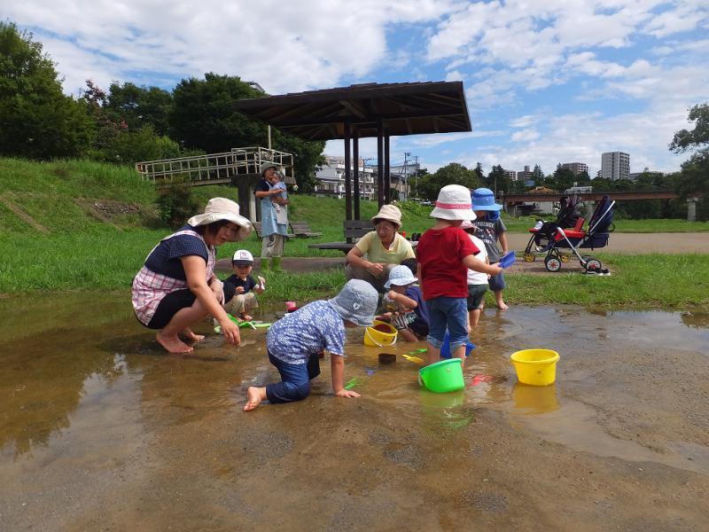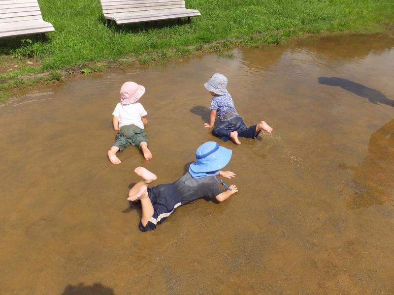 お姉さん好きなこどもたちですから、みんな大喜びです。はじめからべったりくっついていた子、行きたいきもちを抑えて、しばし観察してから、の子、いろいろでしたが、結局はみんな、おねえさんたちに遊んでもらって、嬉しい二日間でした。絵本を読んでもらったり、一緒にプール遊びをしたり、楽しくって、楽しくって、“あしたもくる?”