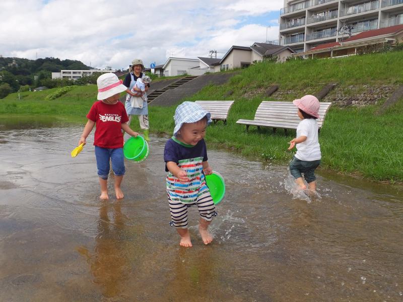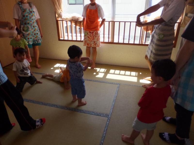 お姉さん好きなこどもたちですから、みんな大喜びです。はじめからべったりくっついていた子、行きたいきもちを抑えて、しばし観察してから、の子、いろいろでしたが、結局はみんな、おねえさんたちに遊んでもらって、嬉しい二日間でした。絵本を読んでもらったり、一緒にプール遊びをしたり、楽しくって、楽しくって、“あしたもくる?”