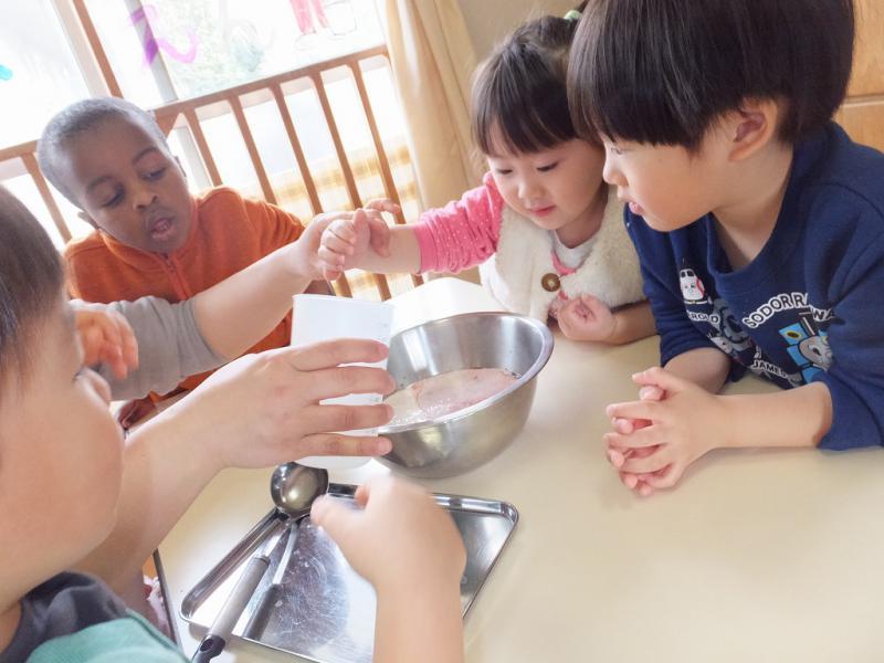 午前中、真剣な顔の2歳児クラスこどもたちがかわるがわるフルーチェを混ぜ、器に盛り付けました。そのまましばし冷蔵庫へ!