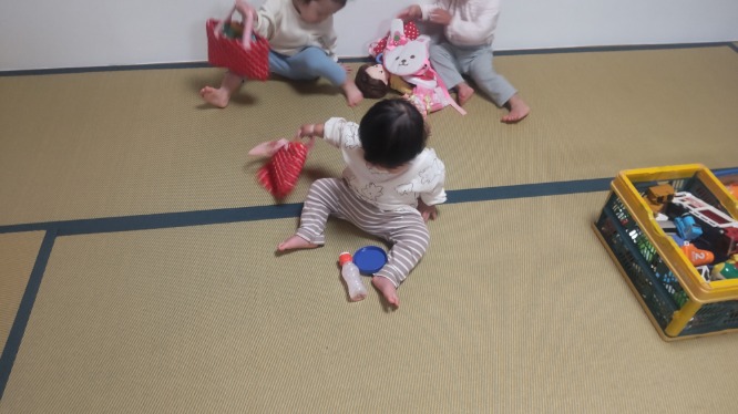 おねえさんたちが バッグに物を詰めて お買い物遊びをしているのをみて