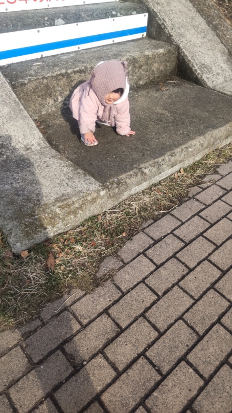 階段によじ登って サポートありで ぴょん と 飛び降りたり