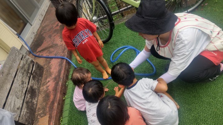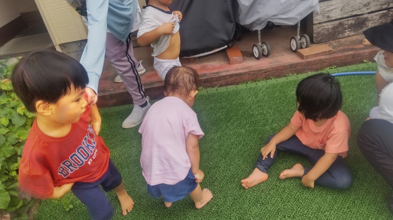玄関先で 泥んこと汗を 気持ちよく洗い流してから